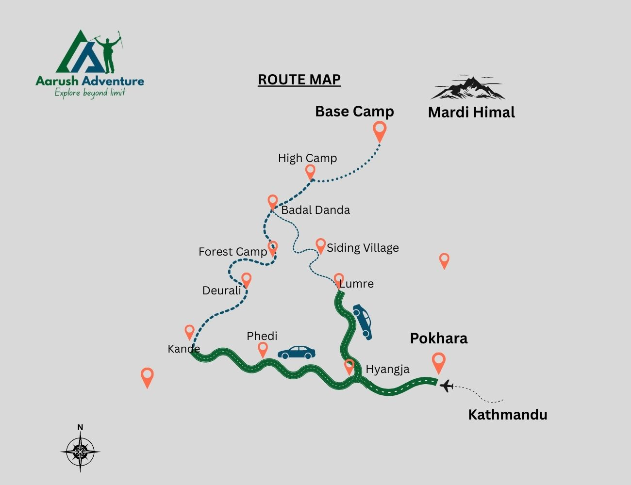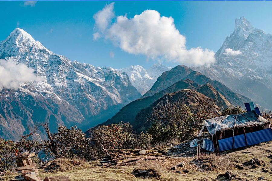 The trek to Mardi Himal Base Camp begins from the picturesque village of Dhampus Phecdi, which is accessible from Pokhara. As you ascend, you will pass through dense forests of rhododendron, oak, and pine, providing a rich variety of flora and fauna. The trail meanders through charming Gurung villages, where trekkers can experience the traditional lifestyle and culture of the local people. Along the way, you will also encounter panoramic views of the surrounding peaks, with each day offering a new perspective of the mighty Himalayas.